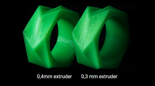 Lze využít extrudér o průměru 0,3 mm, který se nabízí jako samostatný doplněk k dokoupení, jenž oceníte při složitějších tiskových pracích. Umožní totiž tisknout ještě hladší povrch při rozlišení 50 mikronů.