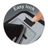 Během přenášení aktivujte bezpečnostní zámek, aby žehlička zůstala pevně umístěná na základně a nehrozilo riziko vzniku nehody. Stejně snadno (stiskem tlačítka) poté zámek i odemknete, abyste mohli zařízení začít ihned používat.