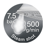 Parní ráz 500 g/min zajistí rychlé a snadné žehlení i těch nejméně poddajných látek. Před takovou silou páry se neschovají dokonce ani ty nejodolnější záhyby.