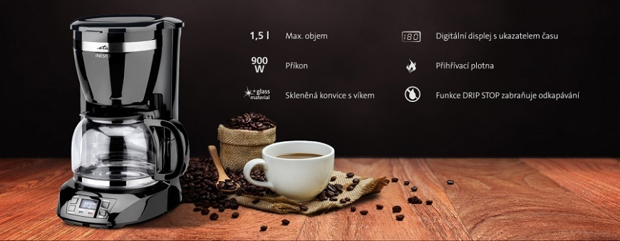 Kávovar na překapávanou kávu s konvicí o objemu 1,5 l s funkcí časovače a přihřívání.