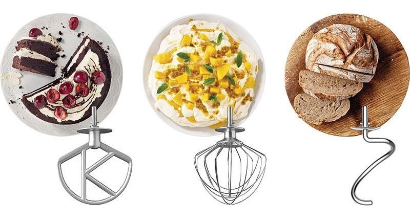 Různé druhy receptů si žádají speciální nástavec. K-metla je ideální pro piškotové těsto, těsto na sušenky, cukrovinky nebo koláče. Pokud chystáte nádivku nebo náplně, rozhodně je K-metla skvělá volba. Šlehací metla zvládne nadýchanou šlehačku, sněhové pusinky, suflé, lehká těsta, majonézu nebo omáčku. Unikátní tvar hmotu provzdušní a dodá ji nadýchanou konzistenci. Hnětací hák je vhodný pro těsto na domácí chléb, pizzu, těstoviny nebo kynuté těsto na koblihy.