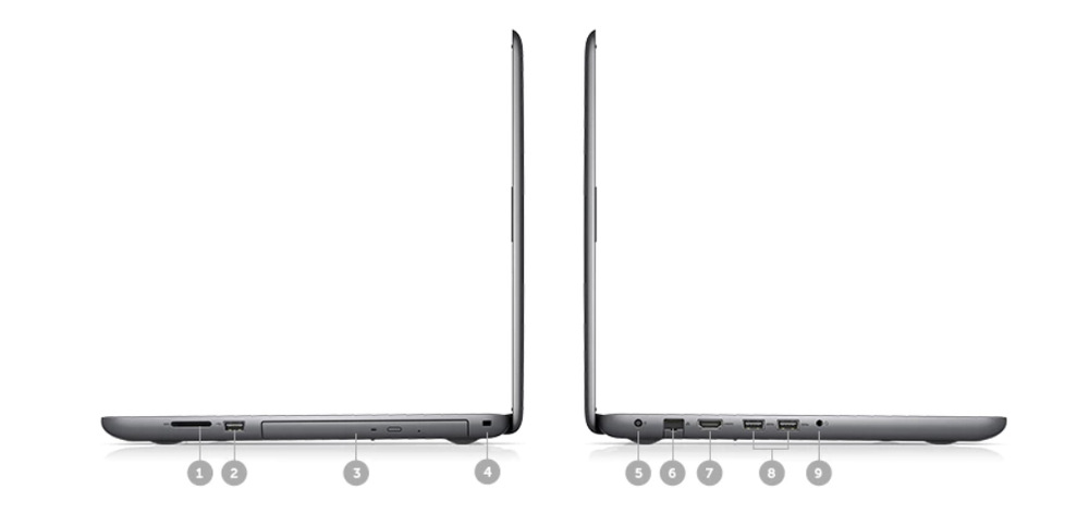 Vyberte si z široké nabídky možností připojení, díky kterým je notebook vysoce kompatibilní s celou řadou různých zařízení. Nechybí slot pro SD kartu (1), 3× USB 3.0 (2, 8), DVD mechanika (3), zámek Nobel (4), konektor pro adaptér (5), gigabitový ethernet (6), HDMI (7) a kombinovaný konektor typu jack pro sluchátka a mikrofon (9).