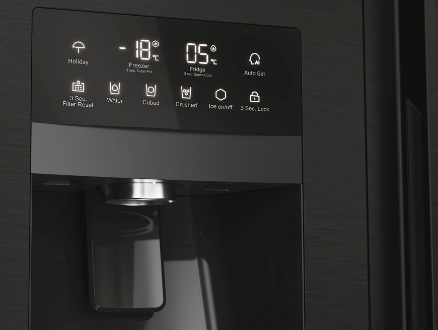 Chladnička nabízí jednoduché nastavení všech funkcí tak, aby splňovaly vaše požadavky. Na dotykovém displeji si můžete nastavit funkce Rychlé chlazení, Rychlé mrazení, Dovolená, Auto nastavení, Ukazatel filtru/resetování, výdej vody a ledu, Dětská pojistka a Stand by pohotovostní režim.