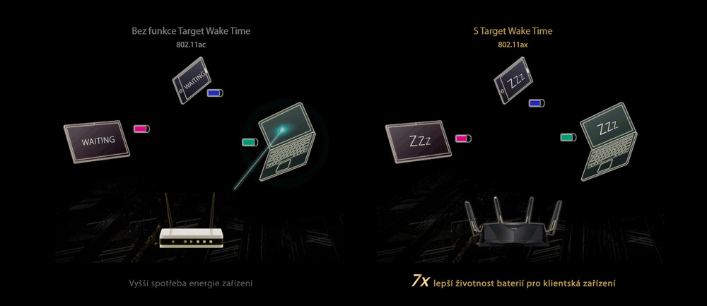 dvoupásmový router • standard Wi-Fi 6 (802.11ax) • rychlost 6 000 Mb/s • 4 antény • 8 LAN portů • zabezpečení AiProtection Pro • kompatibilní se systémem ASUS AiMesh