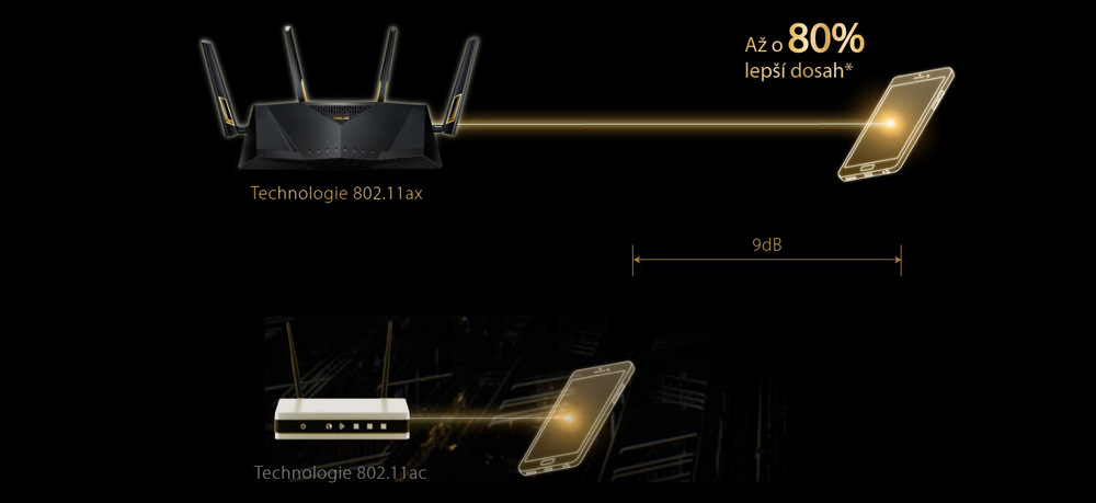 Vítejte v nové éře bezdrátového internetu. Dvoupásmový router dokáže navázat připojení se všemi dostupnými přístroji ve vaší domácnosti, které připojí k Wi-Fi s maximální přesností, rychlostí a bez zádrhelů. Kombinací obou pásem zaručí rychlost až 6 000 Mb/s.