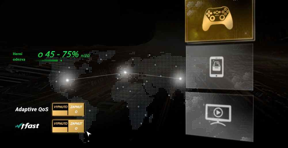 Dvojnásobné zrychlení online her již není pouze zbožným přáním všech milovníků počítačových her. Router s adaptivním QoS efektivně přiřazuje vyšší prioritu herním paketům a postará se až o 75 % nižší herní odezvu oproti jiným routerům.