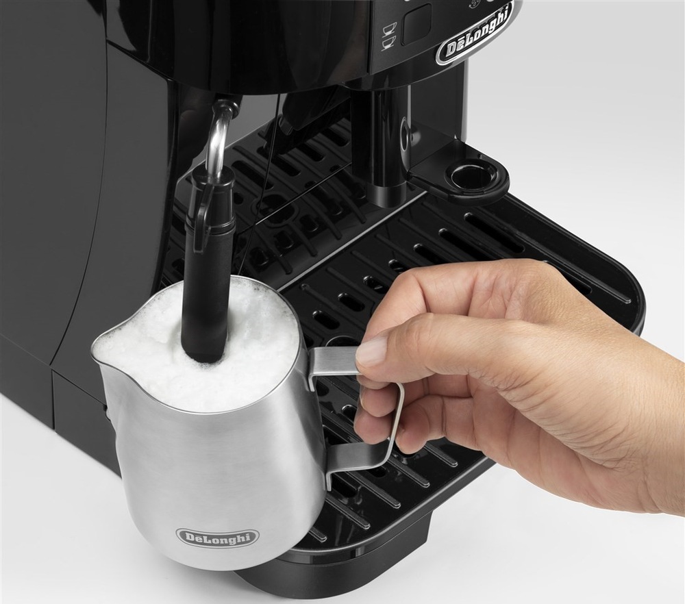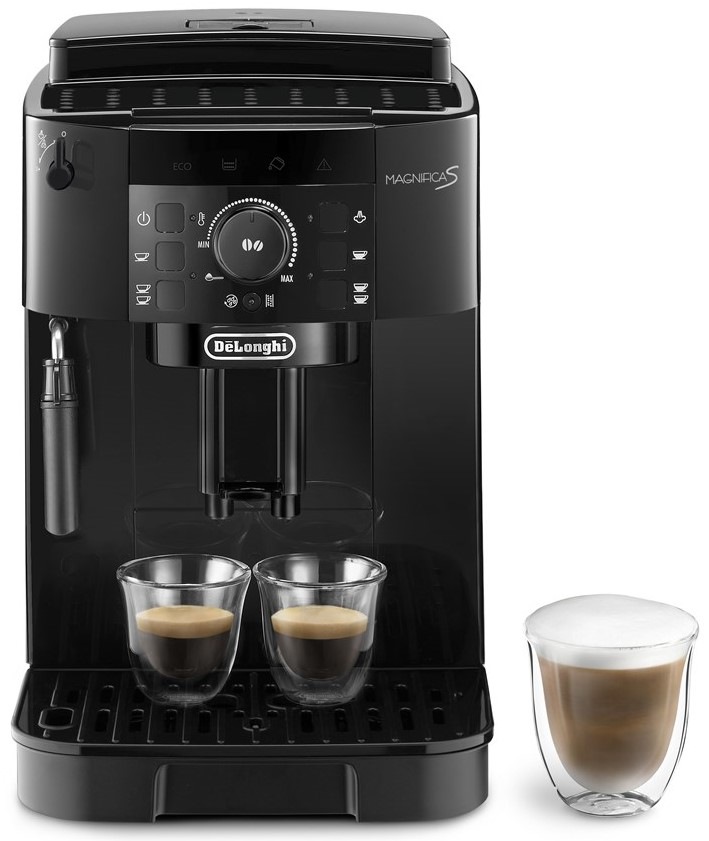 Automatický kávovar De'Longhi ECAM 12.121.B Magnifica S, který nabízí profesionální přípravu s důrazem na chuť a bohaté aroma, vám připraví kávu tak, jak ji máte rádi. Kávovar s příkonem 1 450 W a vysokým tlakem čerpadla 15 barů je zárukou dokonalé chuti. Lze ho použít s kávovými zrny nebo s již namletou kávou. Potěší vás elegantní štíhlou konstrukcí s minimalistickými tvary, kvalitním zpracováním, jednoduchou obsluhou a nenáročnou údržbou. Na výslednou chuť kávy mají vliv nejen dokonale namletá kávová zrna, ale také jejich kvalita a spařování. Proto je kávovar vybaven kvalitním ocelovým mlýnkem, topným tělesem Termoblok a funkcí předspaření. S klasickým napěňovačem můžete během chvilky obohatit šálek kávy krémovou vrstvou jemné mléčné pěny a vychutnat si cappuccino, flat white nebo latté. Ve výbavě zařízení je také automatická čisticí a odvápňovací funkce, která se postará o bezchybný a dlouhodobý provoz spotřebiče. Využít můžete také vodní filtr, který zlepšuje kvalitu vody a zpomaluje proces tvoření vodního kamene.