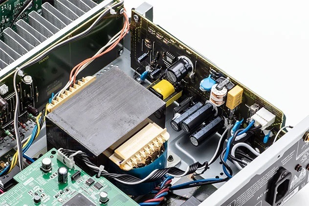 Jednou ze součástek receiveru je také oddělený napájecí transformátor. Díky zapojení mimo obvody ostatních prvků dochází ke snížení rušení, aby byl zvuk ještě čistější.