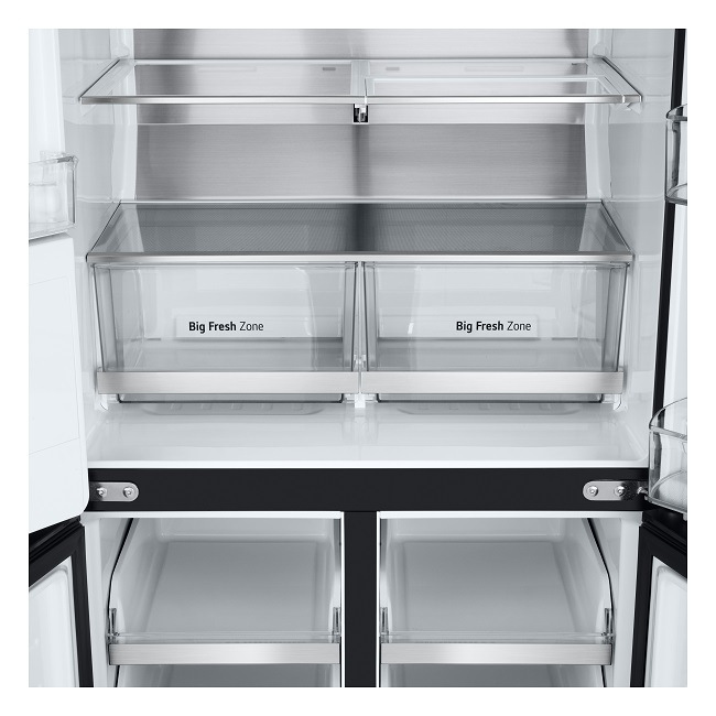 Elegantní černá čtyřdveřová americká lednice LG GMG860EPBE se může stát ozdobou každé moderní kuchyně. Díky celkovému objemu 508 l pojme nejeden velký nákup a variabilní vnitřní uspořádání umožní pohodlné a přehledné uložení potravin. Beznámrazová technologie LG Total No Frost zaručí, že se na stěnách spotřebiče nebude tvořit námraza. Jeho údržba tak bude velmi snadná. Systém DoorCooling+™ poskytuje rychlejší obnovu chladného vzduchu uvnitř a minimalizuje teplotní rozdíly v lednici. Zároveň dochází k cirkulaci vzduchu díky otvorům rozšířeného proudění Multi Air Flow.