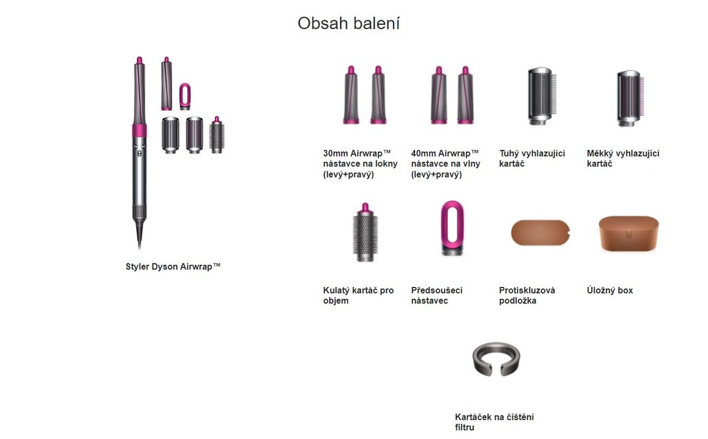 V balení najdete celkem sedm kusů příslušenství, které uspokojí potřeby pro úpravu různých typů vlasů. Nechybí zde 30mm nástavec pro tvorbu bohatých loken, 40mm nástavec na menší kudrliny, tuhý a měkký vyhlazující kartáč pro dokonalý vzhled účesu, kulatý kartáč, který dodá ochablým a zplihlým vlasům objem. Najdete zde také předsoušecí nástavec, jenž lehce prosuší mokré vlasy a připraví je pro následný styling, a dále čisticí kroužek pro rychlé a jednoduché čištění filtru.
