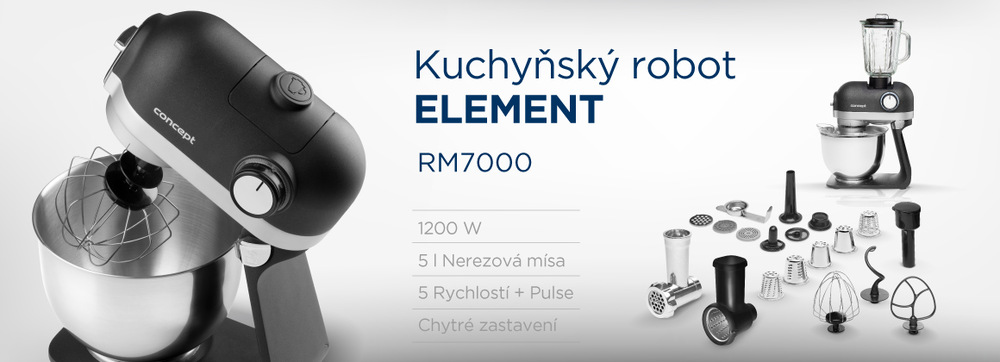 Kuchyňský robot Concept RM7000 ELEMENT je univerzální a silný pomocník, který za vás v kuchyni zastane spoustu práce. Tím vám ušetří nejen čas, ale také energii, kterou můžete věnovat jiným aktivitám. Tento model lze použít nejen jako mixér, ovládá také funkce strouhání, mixování, hnětení, šlehání a plnění uzenin. Můžete jej použít jako mlýnek na maso nebo tvořítko na cukroví.