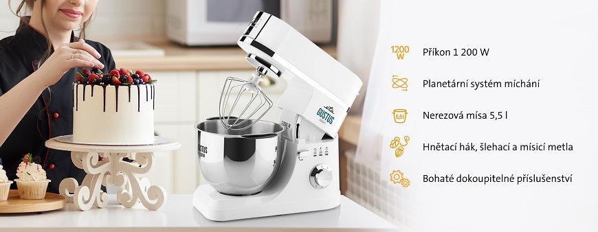 kuchyňský robot • příkon 1 200 W • objem hlavní nádoby 5,5 l • 6 rychlostí • planetární systém míchání • hnětení, mísení, šlehání • nerezová nádoba • pulzní spínač • plynulá regulace rychlosti • mechanické – knoflíkové ovládání • prodloužená záruka • tepelná pojistka, protiskluzové nožičky, bezpečnostní systém výkyvného ramene, části omyvatelné v myčce • hmotnost 7,12 kg