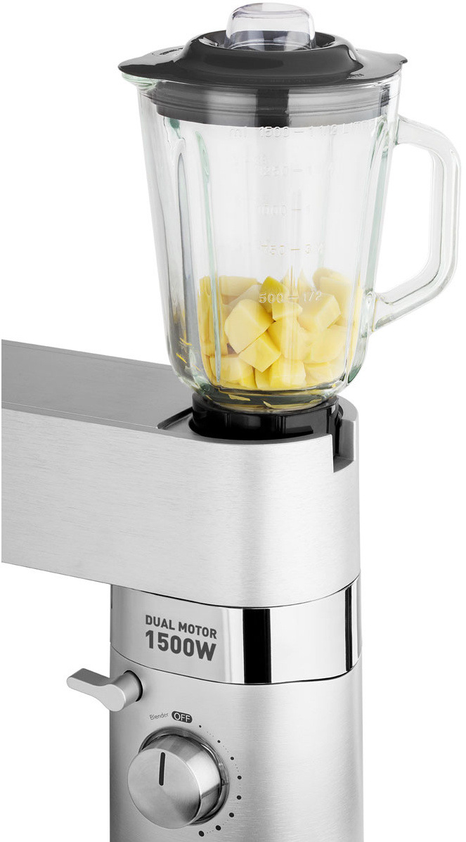 Oceníte také celokovové provedení nejenom vnější, ale také vnitřní konstrukce. Využívá spolehlivou planetovou převodovku. Jednoduchá je také manipulace se spotřebičem a výměna příslušenství vám nezabere ani minutu. Suroviny lze zpracovávat ve velké nádobě o objemu 5,5 litru. Planetární systém míchání, šlehací metla, hnětací hák a plochá metla dokonale promísí všechny ingredience. K dispozici je také 1,5l skleněný mixér.