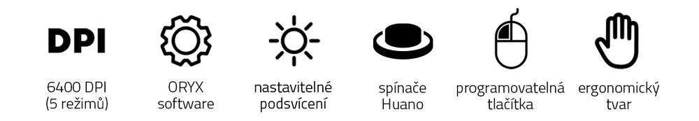 herní myš • určena pro pravou ruku • optický senzor s rozlišením až 6 400 DPI • 7 nastavitelných tlačítek • nastavitelné osvětlení s dynamickými efekty • rychlost 40 IPS • rozhraní USB 2.0 • spínače Huano • teflonové kluznice • software ORYX • 1,8 m opletený kabel • rozměry 125 × 66 × 40 mm • hmotnost 97 g