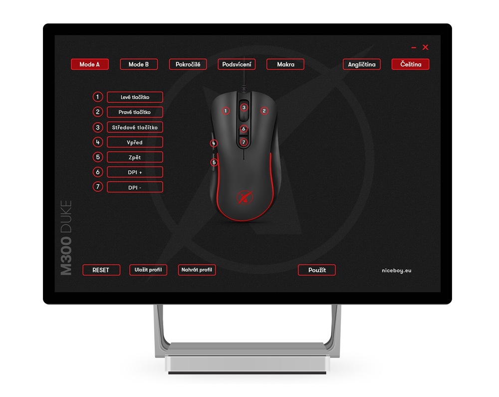 Myš Niceboy ORYX M300 Duke se pyšní speciálním osvětlením s 16,8 miliony barev a nepřeberným množstvím dynamických efektů, které rozzáří váš herní stůl. Osvětlení, stejně jako citlivost jednotlivých tlačítek (až 5 úrovní), jednoduše nastavíte pomocí důmyslného softwaru ORYX.