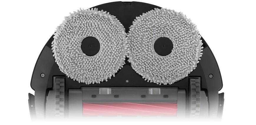 Mopy dosahují rychlosti až 200 otáček/minutu a podlahy důkladně čistí. Pokud vysavač najíždí na koberec, mopy se automaticky zvednou o 10 mm a koberec zůstane suchý.