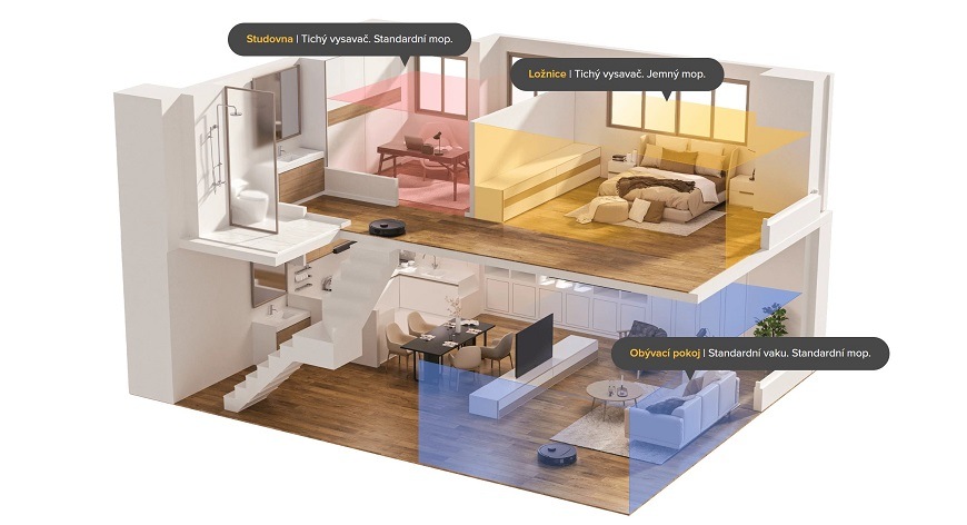 Plánování úklidu je snadné pomocí SmartPlan, který připraví optimální nastavení podle typu podlahy v konkrétní místnosti. Inteligentní navigace si zapamatuje požadavky pro každou místnost.