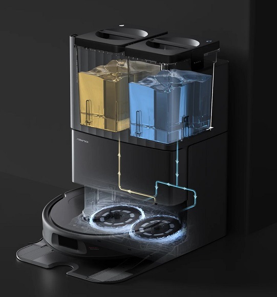 Při návratu do stanice jsou mopy vyprány. 3stupňový dynamický systém je složen z předpírky, středního máchání a odstřeďování ve vysoké rychlosti. Automatické doplňování vody zajistí konstantní vytírání povrchu o rozloze až 330 m2.