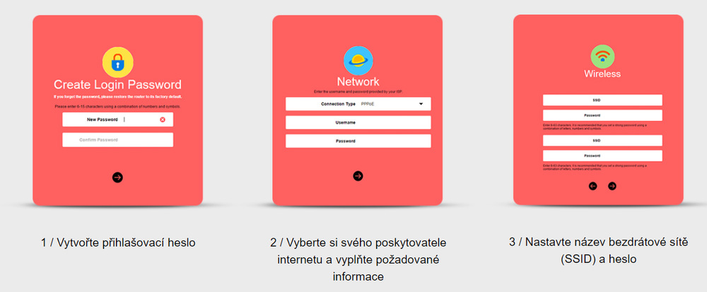 Ke zprovoznění routeru vám stačí několik málo minut. Vytvořte si přihlašovací heslo, vyberte poskytovatele internetu, vyplňte potřebné informace, nastavte název a heslo a máte hotovo. Vše zvládnete prostřednictvím webového uživatelského rozhraní.
