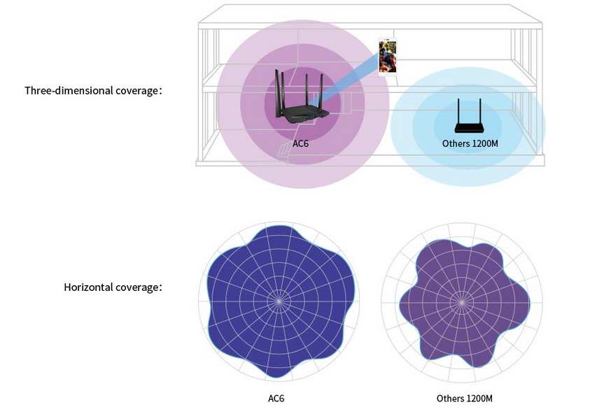 Součástí routeru jsou čtyři 5dBi HG antény, které se starají o důsledné pokrytí všech místností ve vaší domácnosti. Navíc se můžete spolehnout na špičkovou rychlost přenosu dat. Router pracuje v pásmech 5 GHz a 2,4 GHz a zajišťuje rychlost až 1 200 Mb/s, která je ideální nejen pro běžné prohlížení webových stránek, ale také hraní online her či streamování videa ve vysoké kvalitě.