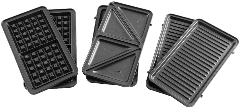 Produkt nabízí opravdu multifunkční využití při přípravě jídel. Stačí si jen vybrat, na co máte zrovna chuť a vložit dané plotýnky do přístroje. V nabídce jsou dva pláty čtvercového tvaru na klasické zapečené tousty. Druhou možností jsou dvě žebrované grilovací plotýnky na maso, zeleninu či zapečené panini a poslední možností je nástavec na přípravu vaflí.