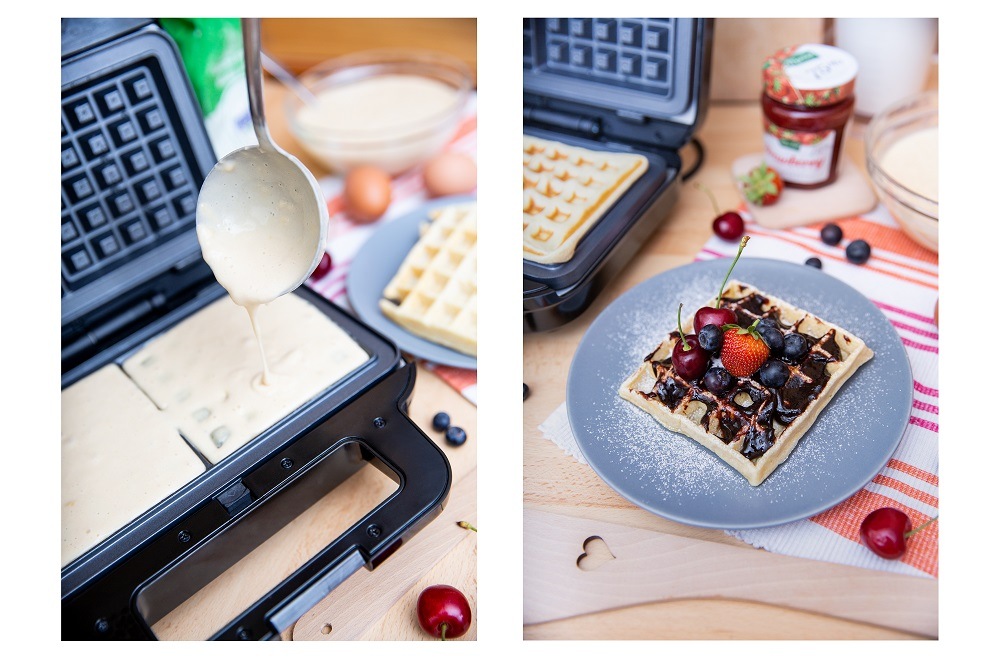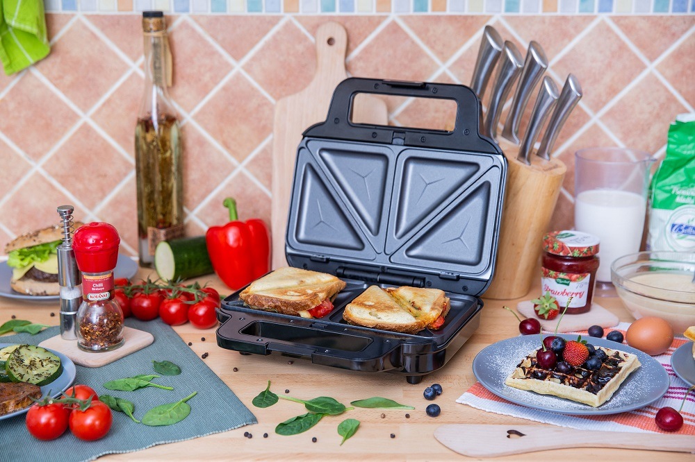 - Multifunkční použití: 3 sady vyjímatelných plátů (na vafle, na tousty, na grilování)