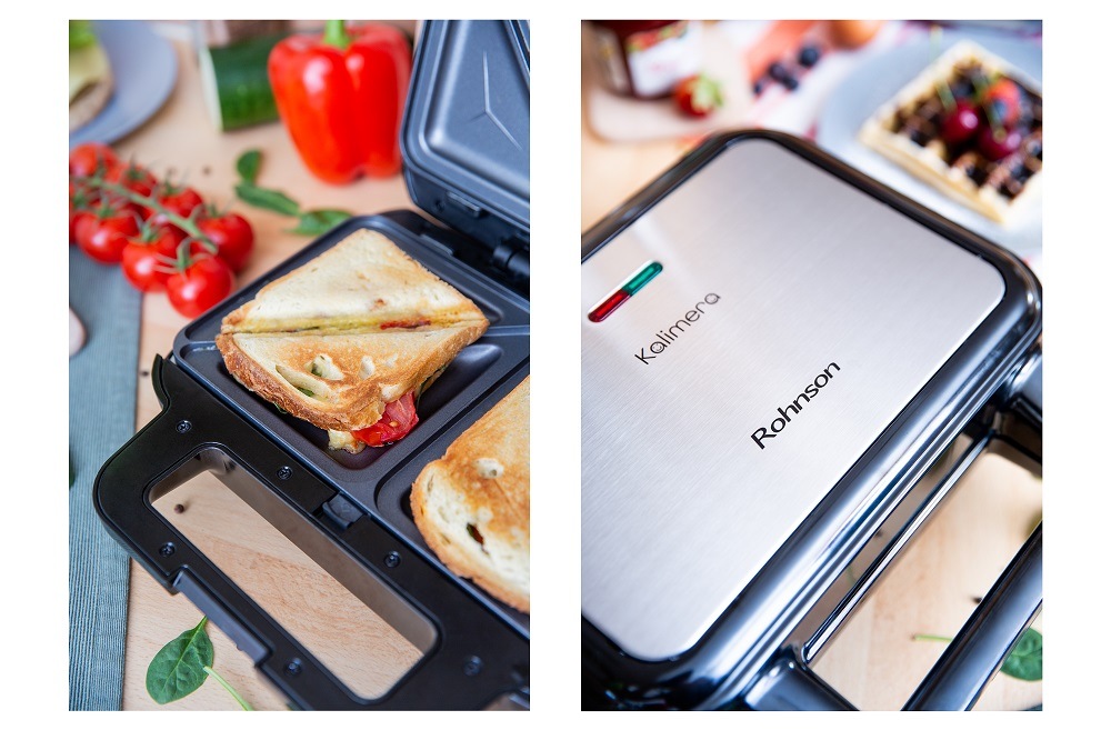 Šetřete místo v kuchyni tím, že si pořídíte sendvičovač Rohnson R-2685 Kalimera XXL s příkonem 900 W, který vám připraví tousty, vafle, ale i ugriluje šťavnaté maso. Balení totiž obsahuje 3 sady výměnných plotýnek, které mají nepřilnavý povrch z teflonu. Každý plát má rozměr o velikosti 26,8 × 14,5 cm. V balení najdete po dvou plátech na přípravu vaflí, dvě plotýnky na grilování a dvě na klasické sendviče.