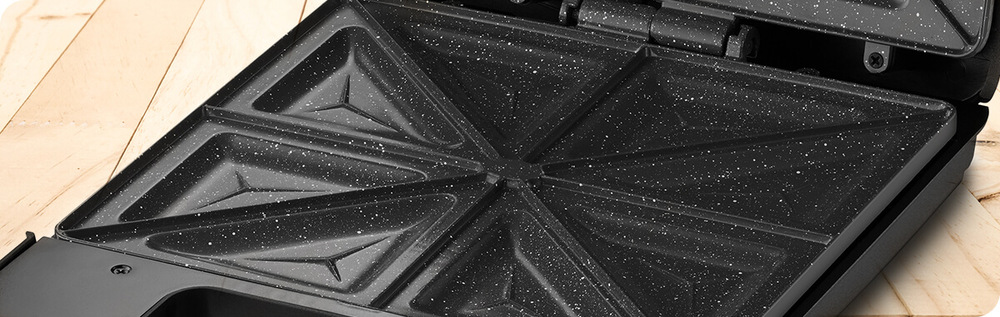 Zapékací plochy dovolují vytvářet teplé občerstvení ve formě 4 sendvičů, které naplníte nejrůznějšími přísadami. Desky jsou opatřeny nepřilnavou plochou s kamenným nátěrem, díky kterému se potraviny nepřipalují k povrchu. Proto je lze také snadno udržovat v čistotě, stačí po každém použití otřít vlhkým hadříkem. Spotřebič je díky svým rozměrům velmi skladný, navíc je možné jej při uchovávat také ve vertikální poloze. Kabel vždy pohodlně ukryjete do úložného prostoru ve spodní části spotřebiče. Protiskluzové gumové nožičky udrži přístroj bezpečně na místě.