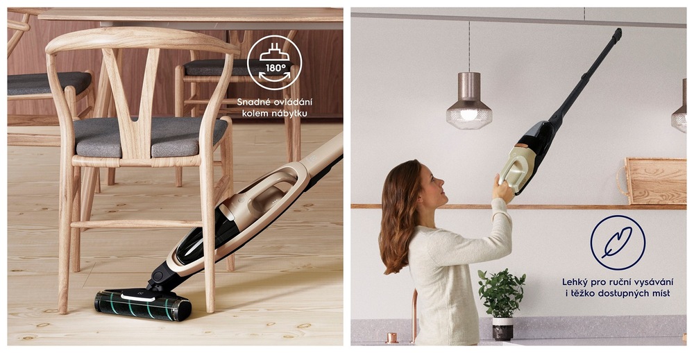 Vysavač se pyšní ergonomickým provedením, díky kterému se pohodlně drží. Ruční jednotka má možnost dvojího uchopení, a proto můžete komfortně vysávat nad úrovní podlahy i ve výškách.