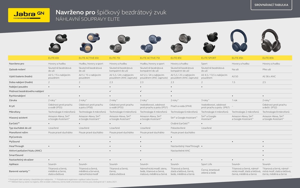 Srovnávací tabulka modelů sluchátek Jabra Elite