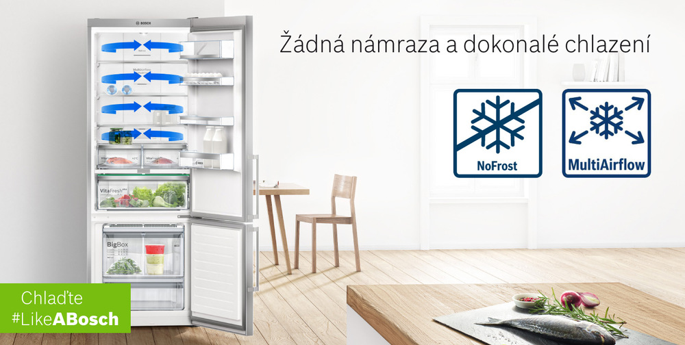 Odmrazování chladničky už je minulostí. Díky funkci NoFrost není potřeba odmrazovat, ušetříte tak čas i námahu. Systém MultiAirflow zajistí, že studený vzduch bude rovnoměrně proudit ve všech úrovních chladničky i mrazničky. Teplota zůstává konstantní a tím docílíte déle trvající chuti a aroma potravin.