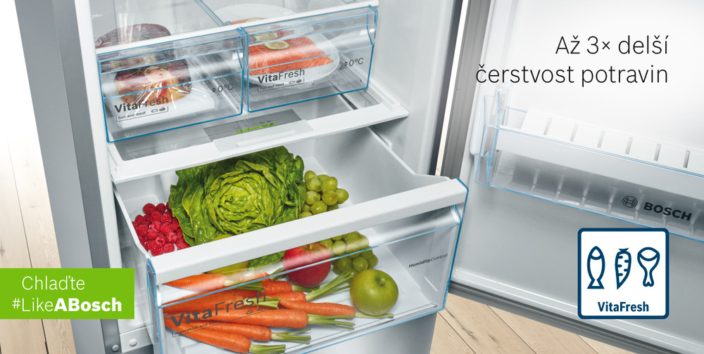 V přihrádkách VitaFresh můžete déle skladovat i potraviny jako maso, ryby, ovoce a zelenina. Tyhle potraviny potřebují různou vlhkost a teplotu, a s tím vám pomůžou přihrádky VitaFresh. Potraviny vydrží déle čerstvé. Zdravý životní styl je na dosah.