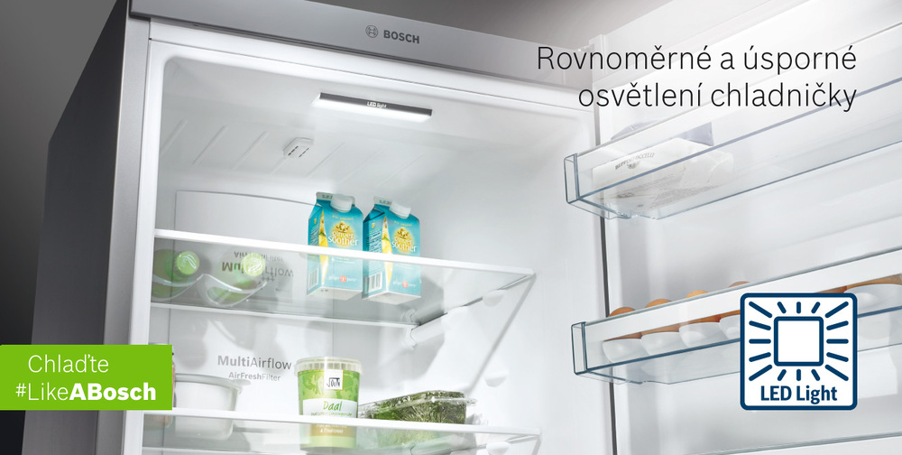 LED světla v chladničce poskytují rovnoměrné a neoslnivé osvětlení celého prostoru. Spotřebují méně energie než konvenční osvětlení chladniček a svítit vydrží po celou dobu životnosti chladničky. To se vyplatí!