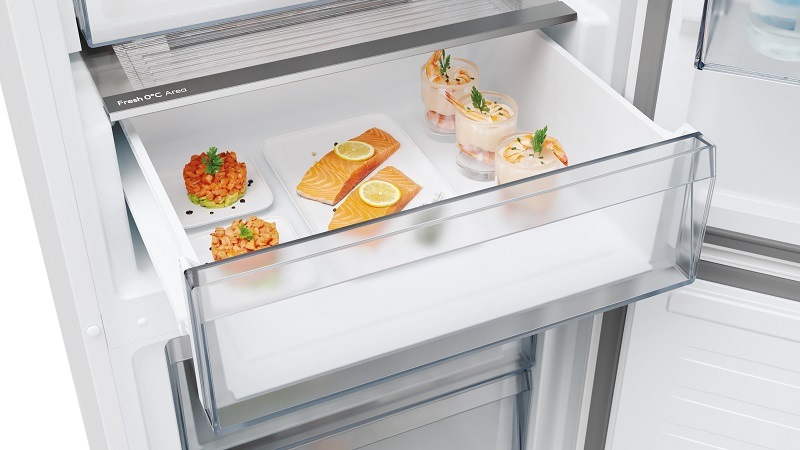 V zásuvce Fresh 0°C Area můžete nastavit nulovou zónu. Režim 0° je ideální pro ryby a maso, a když jej vypnete, získáte prostor zásuvky pro uskladnění potravin, které potřebují být odděleně.