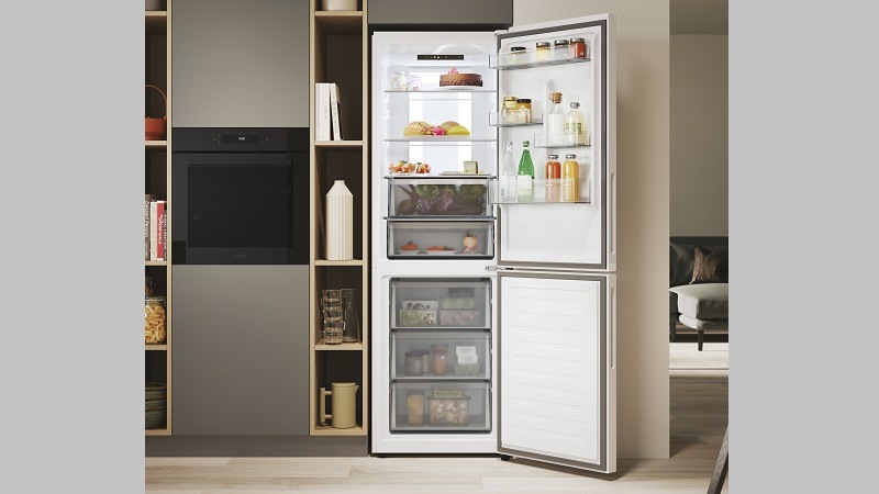 beznámrazová chladnička s mrazákem • výška 185 cm • objem chladničky 235 l / mrazničky 120 l • energetická třída E • Total No Frost Circle Fresh – optimální proudění vzduchu • Panorama LED osvětlení • Fresh 0 °C Area – nulová zóna • Adaptive Humidity Area – vlhkost 90 % • Wi-Fi • aplikace hOn • LED displej • možnost změny směru otevírání dveří • hlučnost 38 dB • V × Š × H: 185 × 59,5 × 66,7 cm