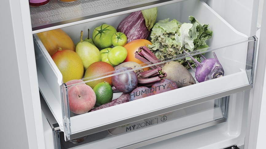 Potraviny, které vyžadují vlhké prostředí můžete uskladnit v zásuvce Humidity Zone s HCS filtrem na horní stěně, který udržuje optimální vlhkost do 90 %. Toto ideální prostředí zajistí dvakrát tak delší čerstvost a šťavnatost. Zásuvka My Zone je ideální pro uchování ovoce, zeleniny, sýrů a má funkci nulové zóny. Rovnoměrná distribuce vzduchu po celém obvodu chladničky pomocí technologie Air Surround Total No Frost přispívá po celou dobu skladování k udržení chuti potravin s minimální ztrátou nutričních hodnot. Navíc už nikdy nemusíte ručně odmrazovat. Uvnitř chladničky také najdete praktický držák na lahve, který lze sklopit zpět do vodorovné polohy a vytvořit tak ještě více prostoru.