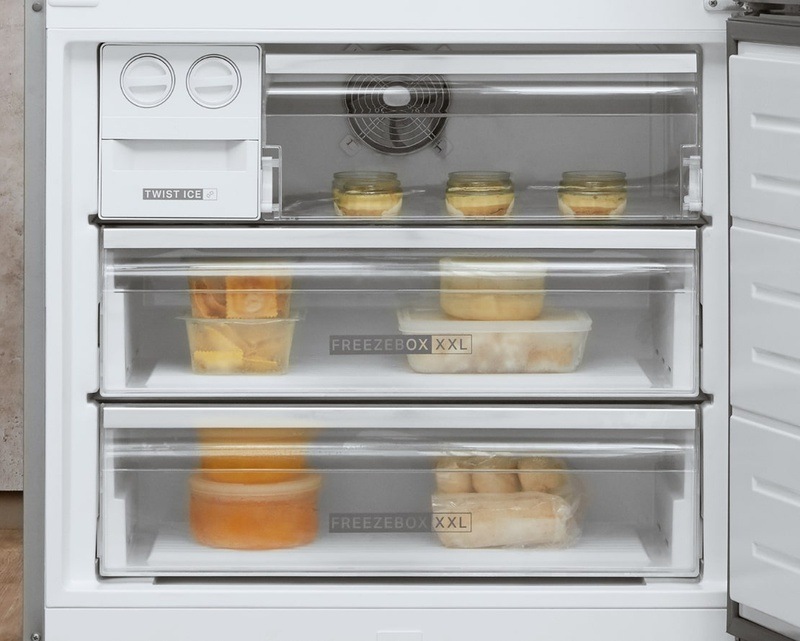 Uvnitř najdete nízkoteplotní zásuvku, která je ideální pro skladování masa a ryb – teplota se v ní totiž pohybuje kolem 0 °C. Chladnička disponuje technologií Total NoFrost, díky které se můžete se zdlouhavým odmrazováním rozloučit. Veškerou vzniklou námrazu totiž dokáže automaticky rozpustit, přičemž voda v ní stéká přes žlábek do misky nad kompresor, odkud se jednoduše odpaří.