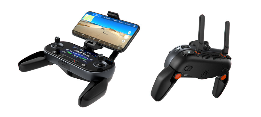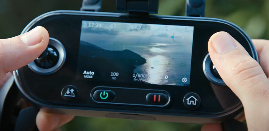 Dálkový ovladač je vybaven barevným displejem, který ukazuje živý náhled z kamery a letové parametry. Ovladač můžete doplnit telefonem a rozšířit si tak „přístrojovou desku“. Otočné voliče a dobře rozmístěná tlačítka umožňují snadné procházení všech nabídek a nastavování expozice. Na displeji telefonu můžete vše ovládat i pomocí dotykové obrazovky.