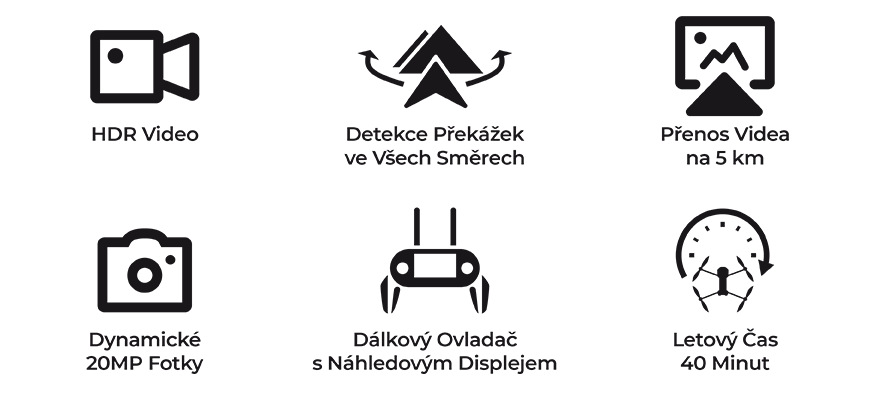 dron • dolet až 5 km • rychlost až 72 km/h • max. doba letu 40 min • max. letová výška 7 000 m • tříosý gimbal • 1" CMOS čip • 20Mpx fotografie • natáčení do 6K při 30 FPS • zorné pole 82° • GPS/GLONASS • interní úložiště 8 GB • microSD až do 256 GB • systém pro aktivní vyhnutí se překážkám ve všech směrech • funkce pro automatický vzlet, přistání a návrat domů • USB-C port • skládací konstrukce • hmotnost 1 174 g
