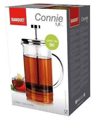 Připravte si lahodnou kávu nebo oblíbený čaj s french press konvicí BANQUET CONNIE 49321701 o objemu 1 l. Samotná konvice je vyrobena z vysoce odolného borosilikátového skla, které bez problémů odolá vysokým teplotám nápojů. Vnitřní část je vybavena filtračním pístem z nerezové oceli, jehož stlačením je dosaženo dokonalého oddělení kávové sedliny nebo sypaného čaje od výsledného nápoje.