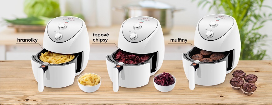 Horkovzdušná fritéza zvládne připravit najednou až půlkila hranolků. Hravě si však poradí i s pečením dortů, sladkých či slaných koláčů, muffinů a poslouží i k opětovnému ohřevu hotových pokrmů.