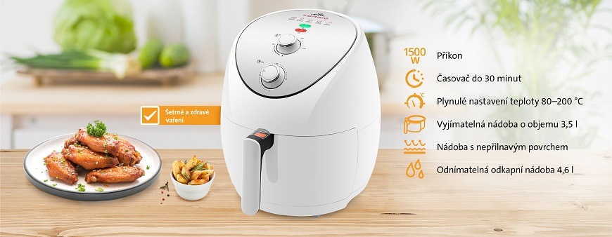 horkovzdušná fritéza • příkon 1500 W • kapacita 3,5 l • regulace teploty: 80 až 200 °C • časovač • vnitřní nádoba z nepřilnavého materiálu • odnímatelná odkapní nádoba 4,6 l • bezpečnostní tepelná pojistka • rozměry produktu: 29 × 32,7 × 35,1 cm