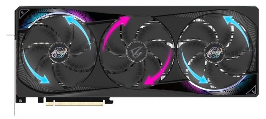 Tento pokročilý systém chlazení využívá speciálně navržené Hawk ventilátory inspirované aerodynamikou orlích křídel, které poskytují o 53,6 % vyšší tlak vzduchu a o 12,5 % větší objem proudění vzduchu. Technologie Alternate Spining dále zlepšuje výkon tím, že střídavě otáčí sousední ventilátory opačným směrem, což minimalizuje turbulence a zvyšuje tlak vzduchu pro efektivnější chlazení. Ventilátory jsou navíc vybaveny konstrukcí s dvojitými kuličkovými ložisky, která zajišťuje lepší odolnost a delší životnost ve srovnání s tradičními ložisky. Díky funkci 3D Active Fan nabízí systém také funkci pasivní chlazení – ventilátory zůstávají vypnuté při nízké zátěži nebo hraní nenáročných her, což zaručuje tichý provoz. Rozšířený chladič navíc umožňuje proudění vzduchu skrze žebrování, což efektivně odvádí teplo. Možnost osadit další přídavný ventilátor dále zlepšuje chladicí výkon, čímž zajišťuje stabilitu i při nejvyšších teplotách. Celý systém tak kombinuje vysokou účinnost, spolehlivost a tichý chod i při maximálním zatížení, což zajišťuje stabilní výkon grafické karty pro hraní i náročné úkoly.