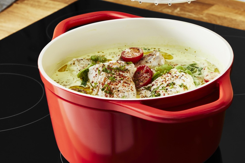 Kastrol Tefal Air z litého hliníku je třikrát lehčí než standardní litinové kastroly, což usnadňuje manipulaci. Díky keramickému povrchu na vnitřní části je snadno čistitelný a vhodný do myčky nádobí, což zajišťuje maximální pohodlí. Kondenzační poklice přispívá k měkkým a šťavnatým pokrmům a silné dno zajišťuje rovnoměrné vaření. Kastrol je všestranný a ideální pro různé recepty, včetně dušených a pečených pokrmů, těstovinových jídel z jednoho hrnce a zeleninových kari. K dispozici jsou také vyhrazené recepty na řadu lahodných pokrmů, které lze získat pomocí QR kódu na obalu. Kompatibilita s plynovou, elektrickou, keramickou a indukční varnou deskou a vhodnost do trouby zajišťují široké využití.