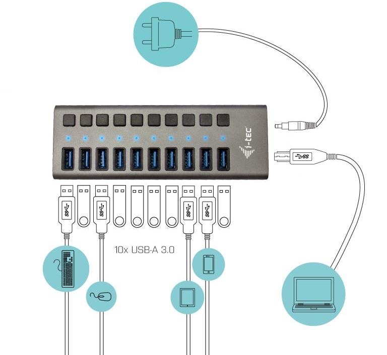 Toto praktické příslušenství obsahuje 10 USB portů 3.0 s funkcí Plug & Play, zpětnou kompatibilitou (USB 2.0, 1.1) a možností klasického USB nabíjení - bude vám tak umožněno nabíjet až 10 zařízení současně. V rámci balení obdržíte také 48W napájecí adaptér, který se postará o nepřerušované dobíjení vašich zařízení, a to s 10W nabíjecím výkonem každého jednotlivého portu. Tak na nic nečekejte, pořiďte si tuto technologickou vychytávku a připojte ke svému počítači nebo notebooku mobilní telefon, fotoaparát, flashdisk a mnoho dalších zařízení najednou.