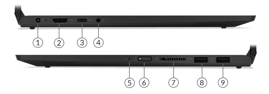 1. DC-in 2. HDMI 3. USB-C 4. Audio jack 5. Tlačítko Novo 6. Tlačítko napájení 7. Čtečka karet 8. USB 3.1 9. USB 3.1