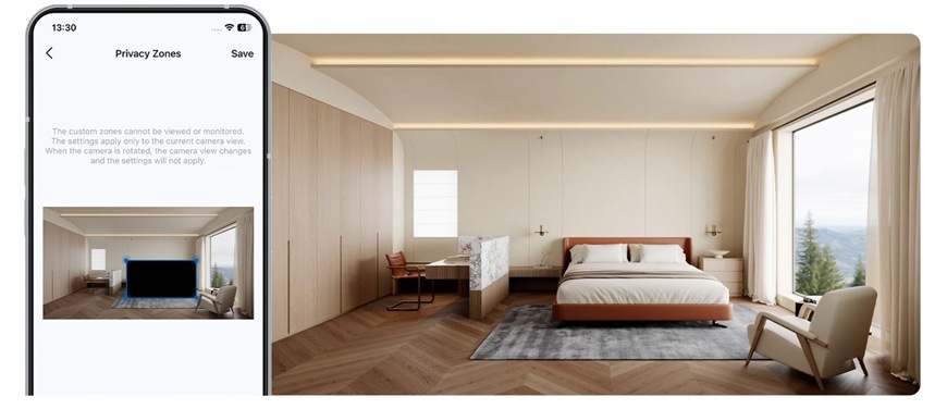 Nahrávejte pouze místa, která potřebují dohled. Pomocí blokovacích zón zabráníte nahrávání konkrétních oblastí, jako je ložnice nebo koupelna. Vaše soukromí zůstane v bezpečí. Vybraný prostor bude zcela mimo záznam.