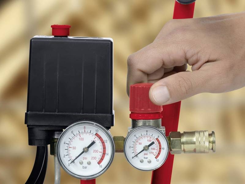 Tlak můžete snadno regulovat vzhledem k tomu, že tento model disponuje redukčním ventilem s manometrem, jak můžete vidět i na obrázku níže.