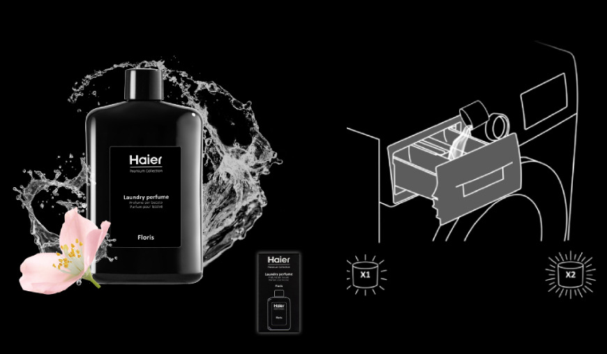 Pro dokonalou vůni vašeho prádla je zde parfém od Haier. Stačí přidat 1 víčko pro jemnou vůni, 2 pro intenzivní. Před spuštěním programu nalijete do zásobníku aviváže. Doporučená dávka je 5 ml na jedno praní, a s objemem 400 ml vydrží až 80 cyklů.