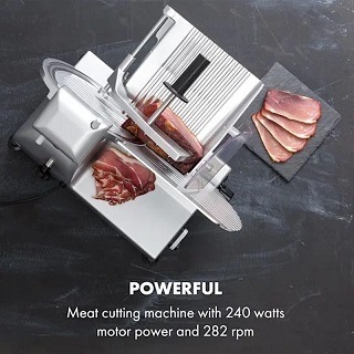 kráječ na maso • příkon 240 W • 282 ot./min • vhodné na krájení masa, klobás, chleba, zeleniny a další (potraviny do velikosti 200 × 155 mm) • vyměnitelný nůž z ušlechtilé oceli • průměr čepele 250 mm • integrovaná bruska • nastavitelný řez: 0 až 12 mm • přívodní kabel o délce 1,40 m • rozměr 42 × 29 × 26,5 cm